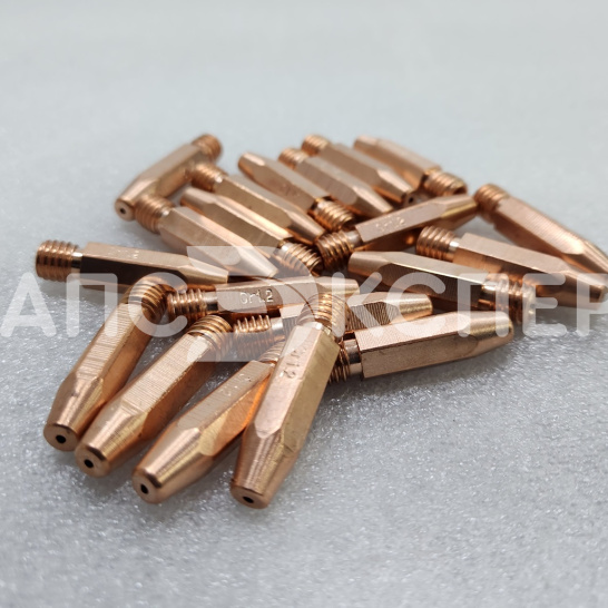 Усиленный контактный наконечник из сплава меди, хрома и циркония (CuCrZr) для полуавтоматической сварки. Предназначен для работы со сплошной и порошковой проволокой диаметром 1.0–1.2 мм. Длина 35 мм и резьба М8×1.0 обеспечивают совместимость с горелками стандарта RF-45 и аналогами.